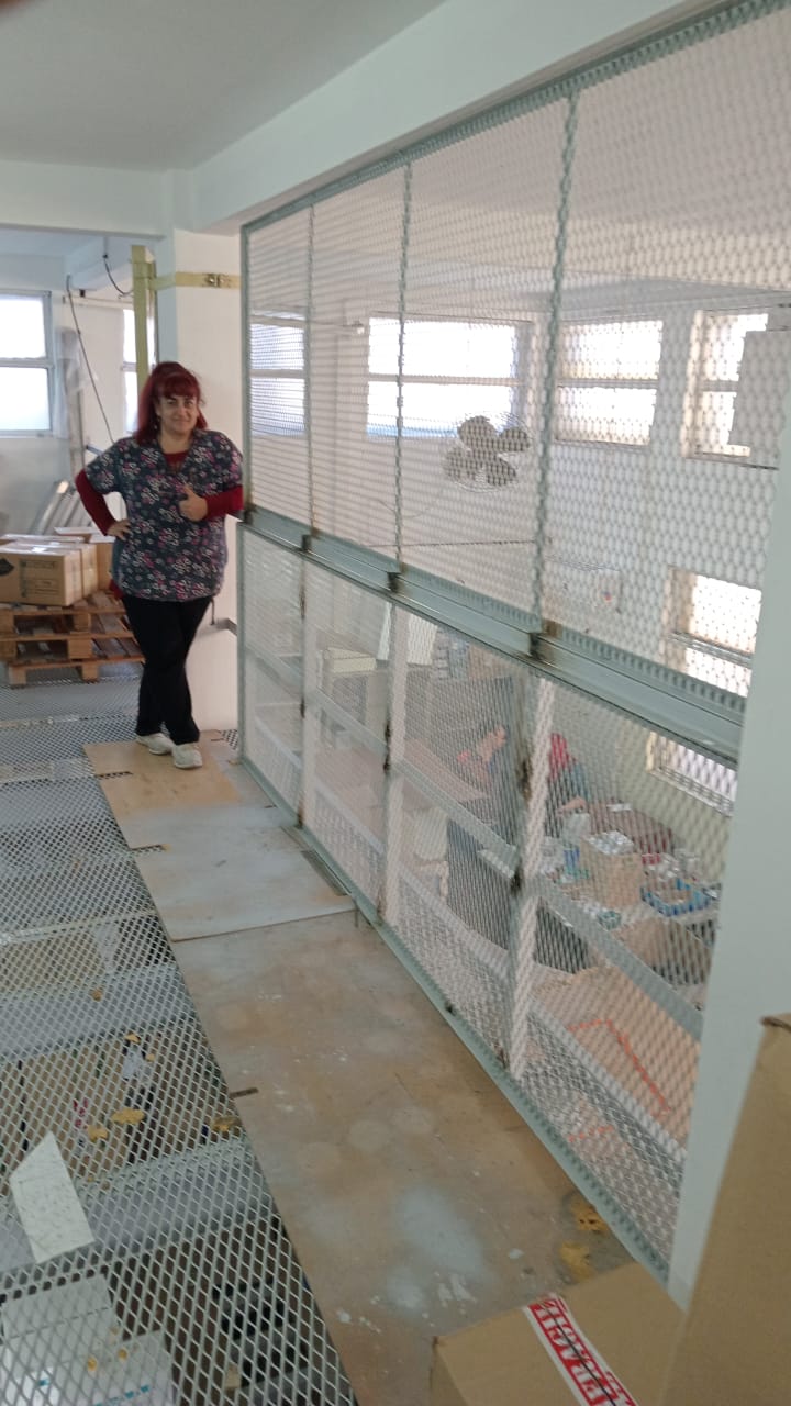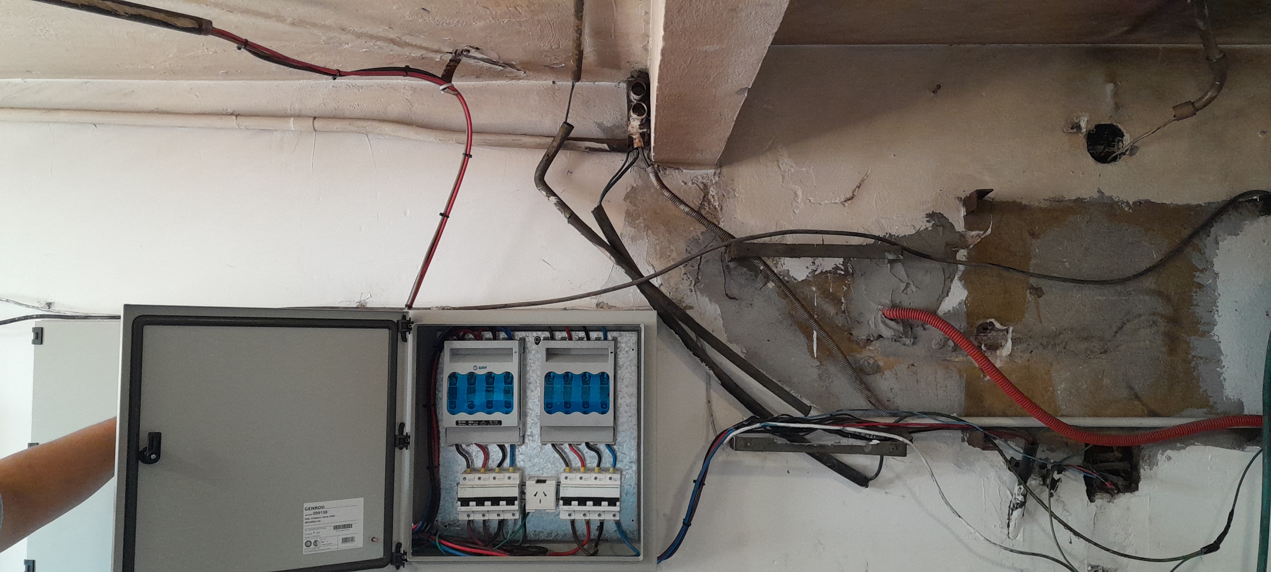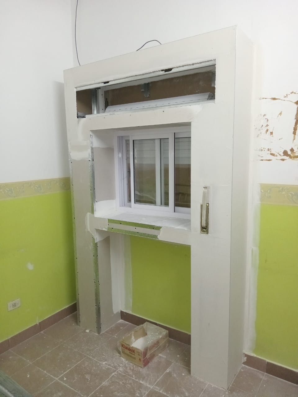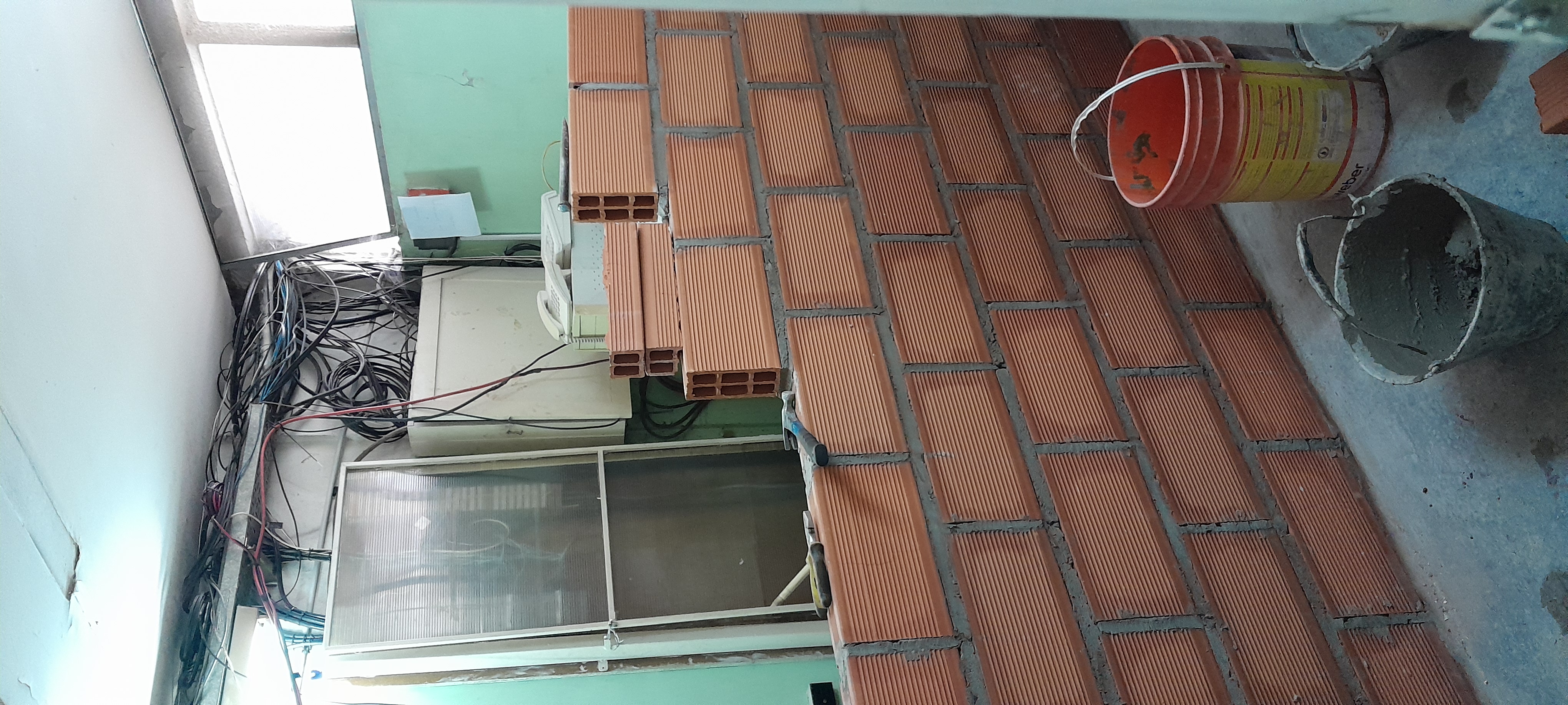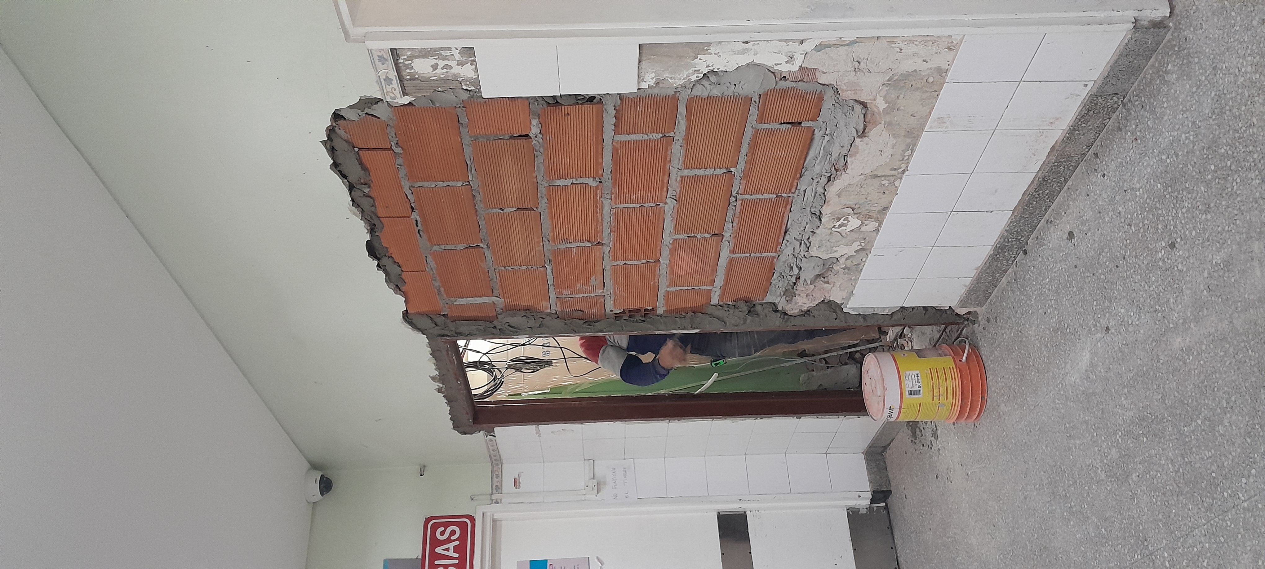 Para lo cual la Asociación Cooperadora se hizo cargo de la compra de los Materiales necesarios y comenzó con el desmonte de una puerta existente, el cegado del vano con mampostería de ladrillos huecos y el canaleteado de los muros para el nuevo trazado de la Instalación eléctrica.