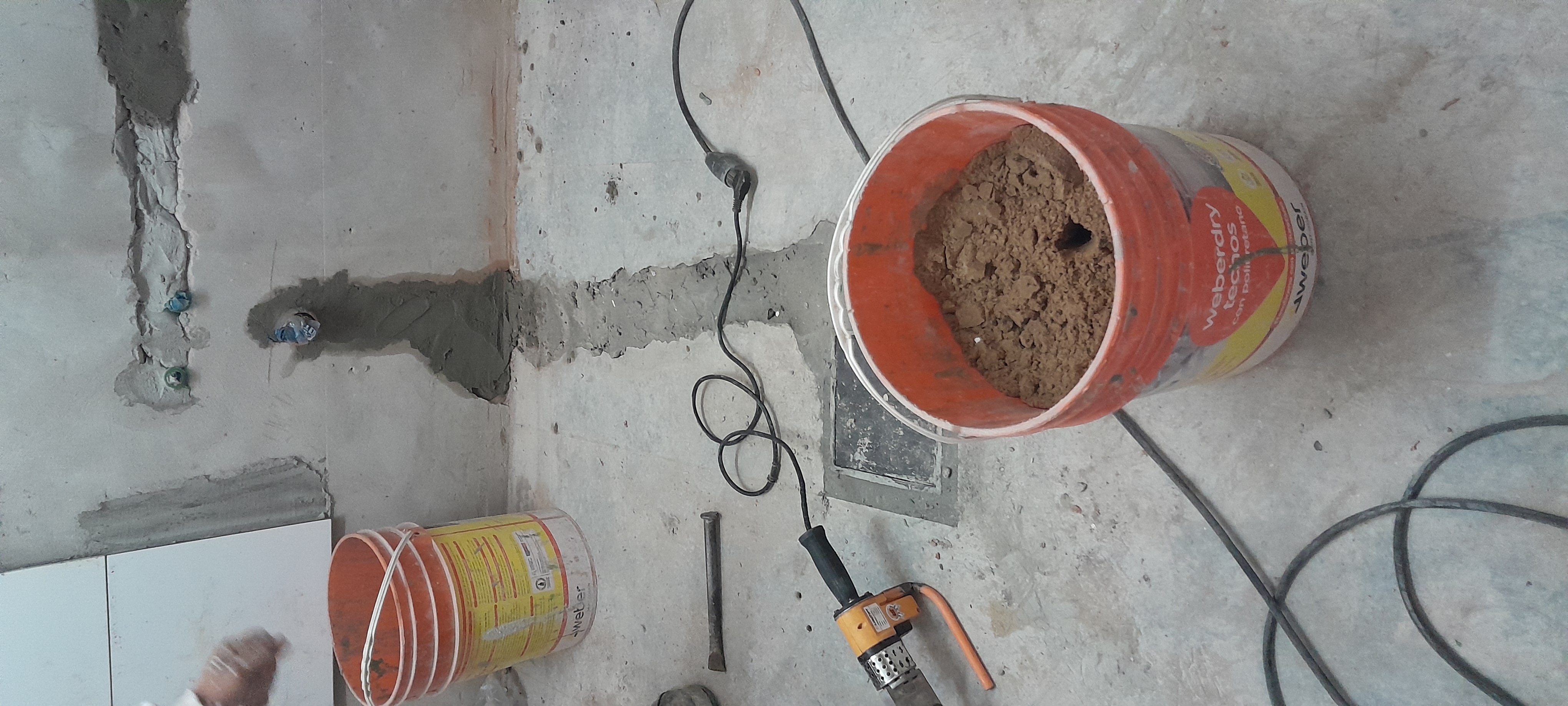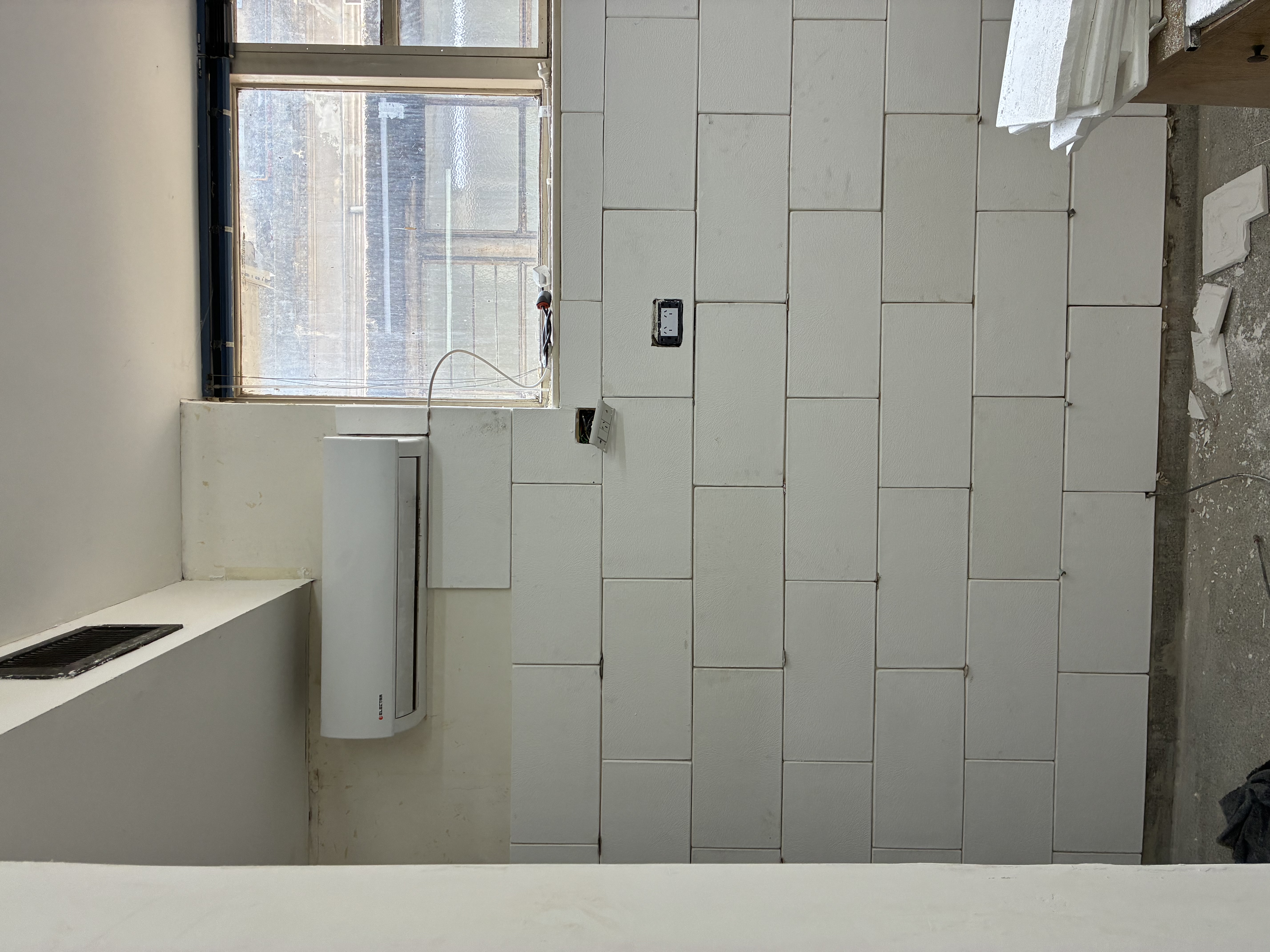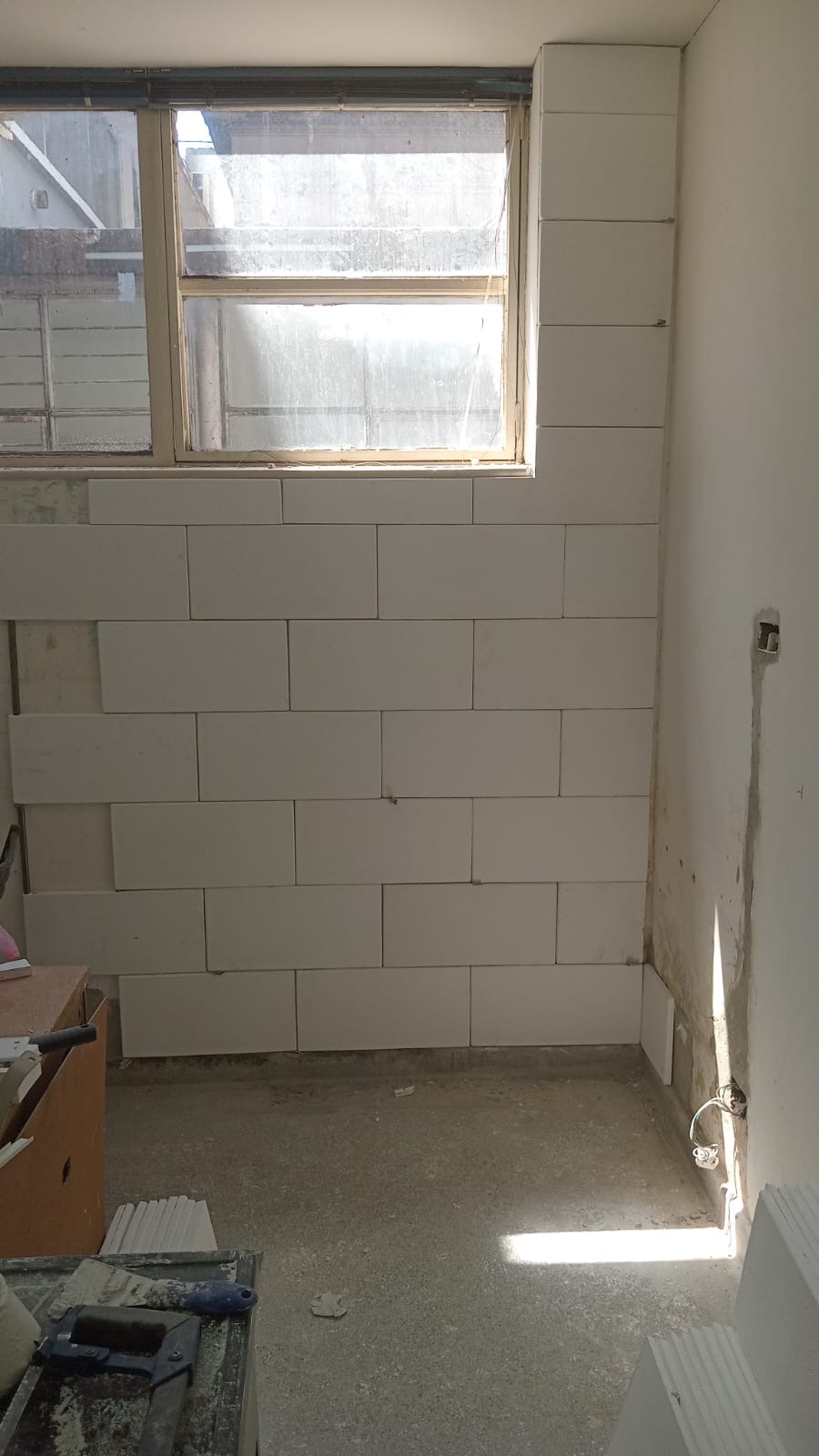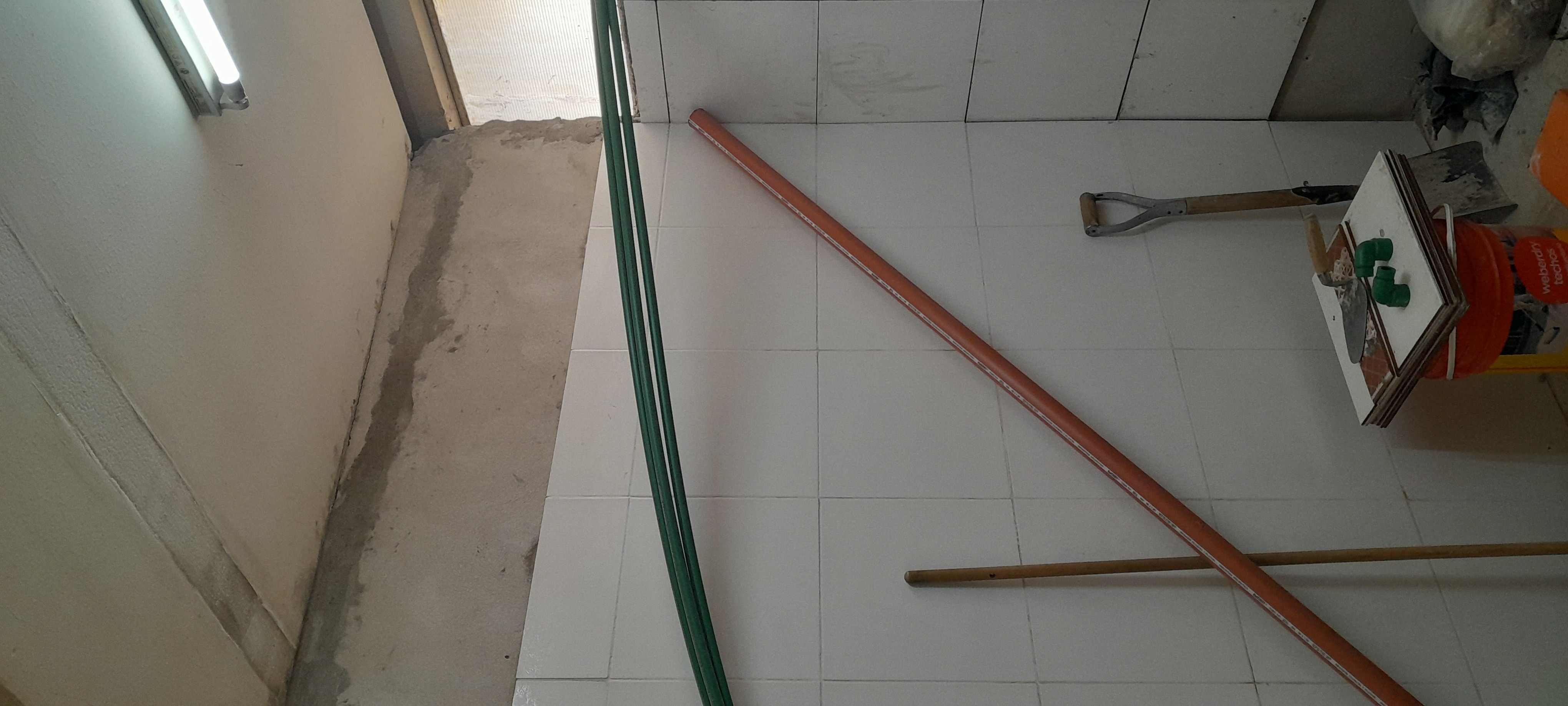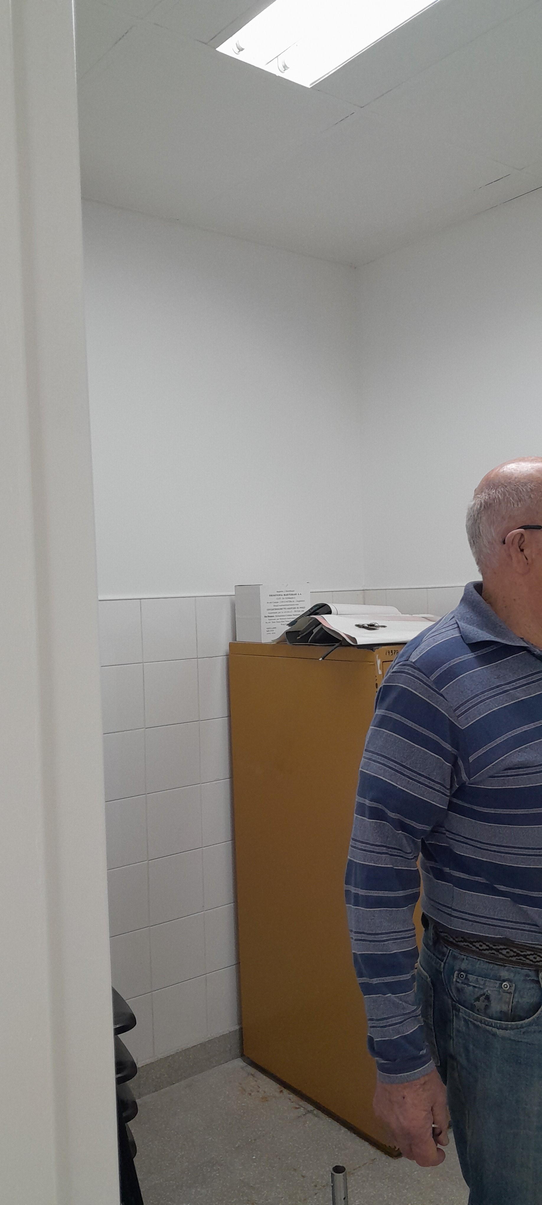Se realizaron los desagües cloacales secundarios nuevos del consultorio, colocando una Boca de acceso con trampa para yeso y conexión hacia cloaca de la guardia, se realizó la cañería de provisión de agua fría y caliente, se completaron los revestimientos cerámicos en el hall de acceso y también en el interior del Consultorio. Restando para la finalización solo una semana de obra.