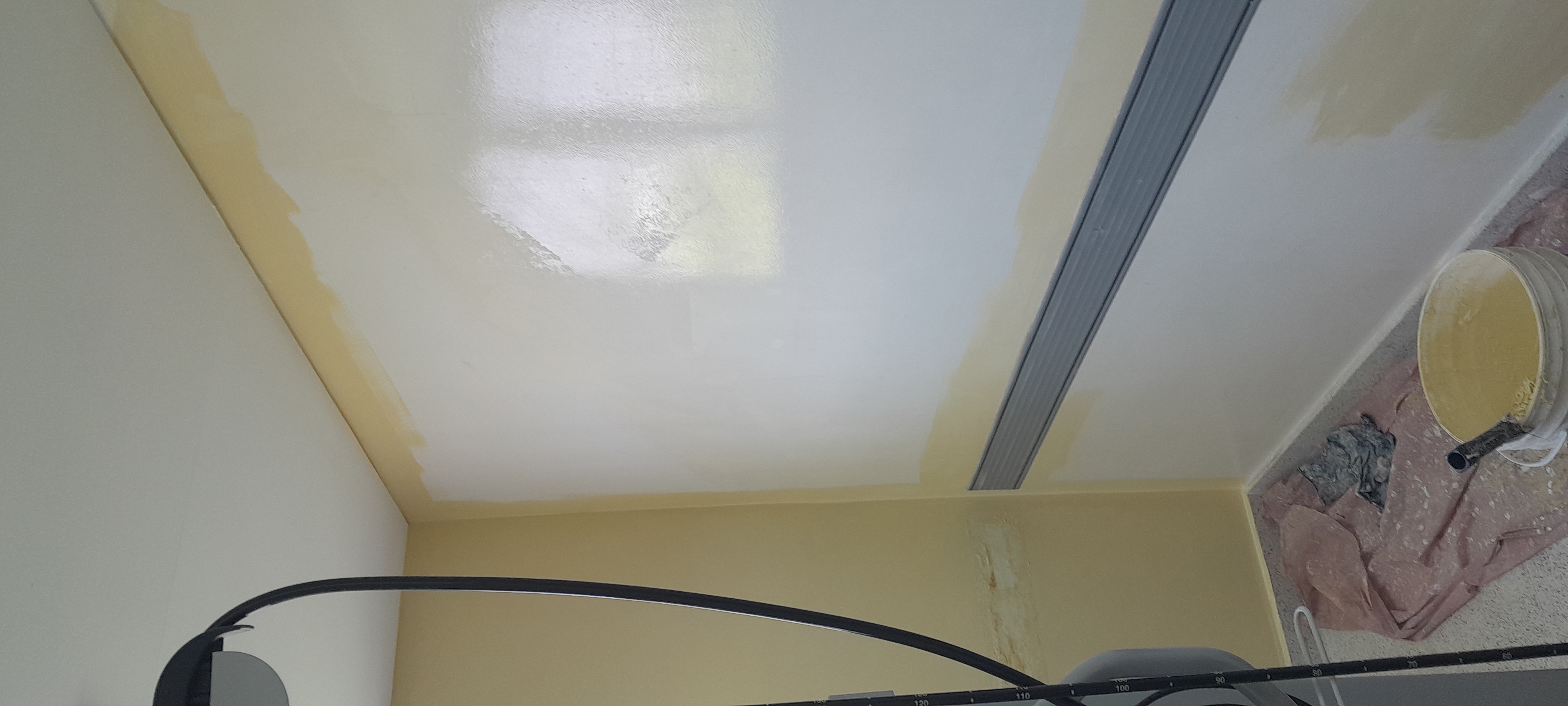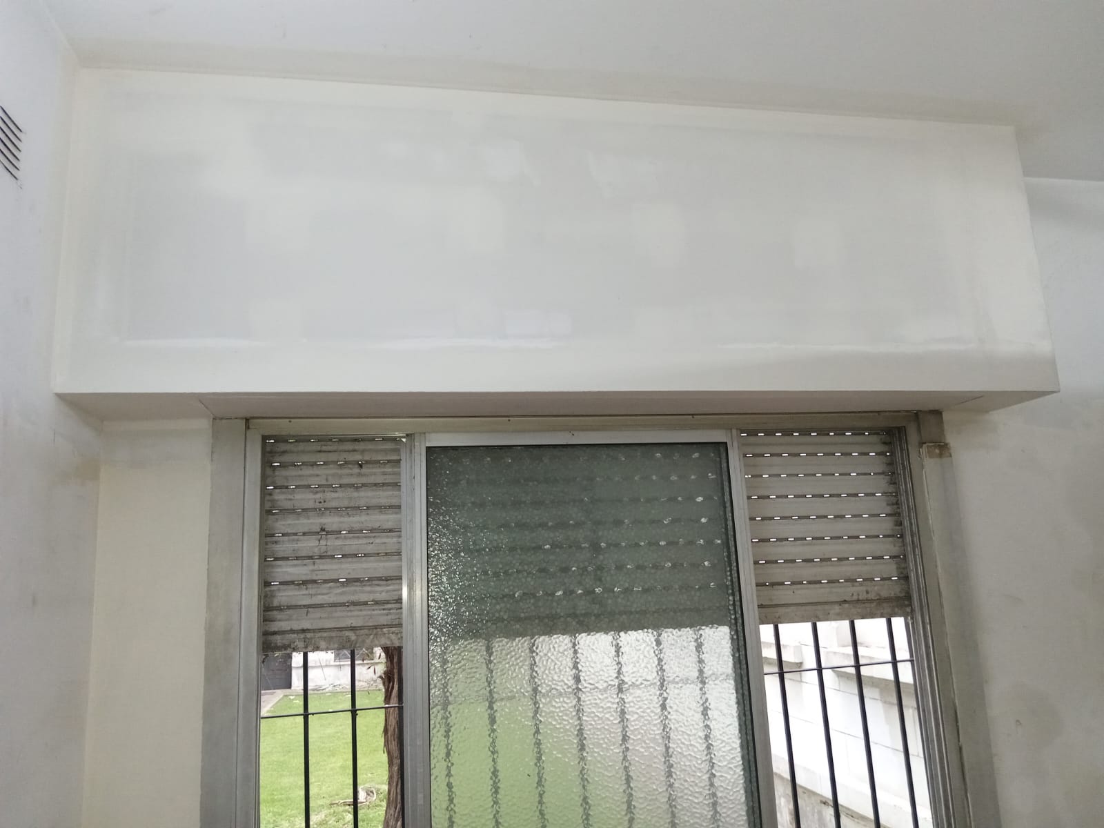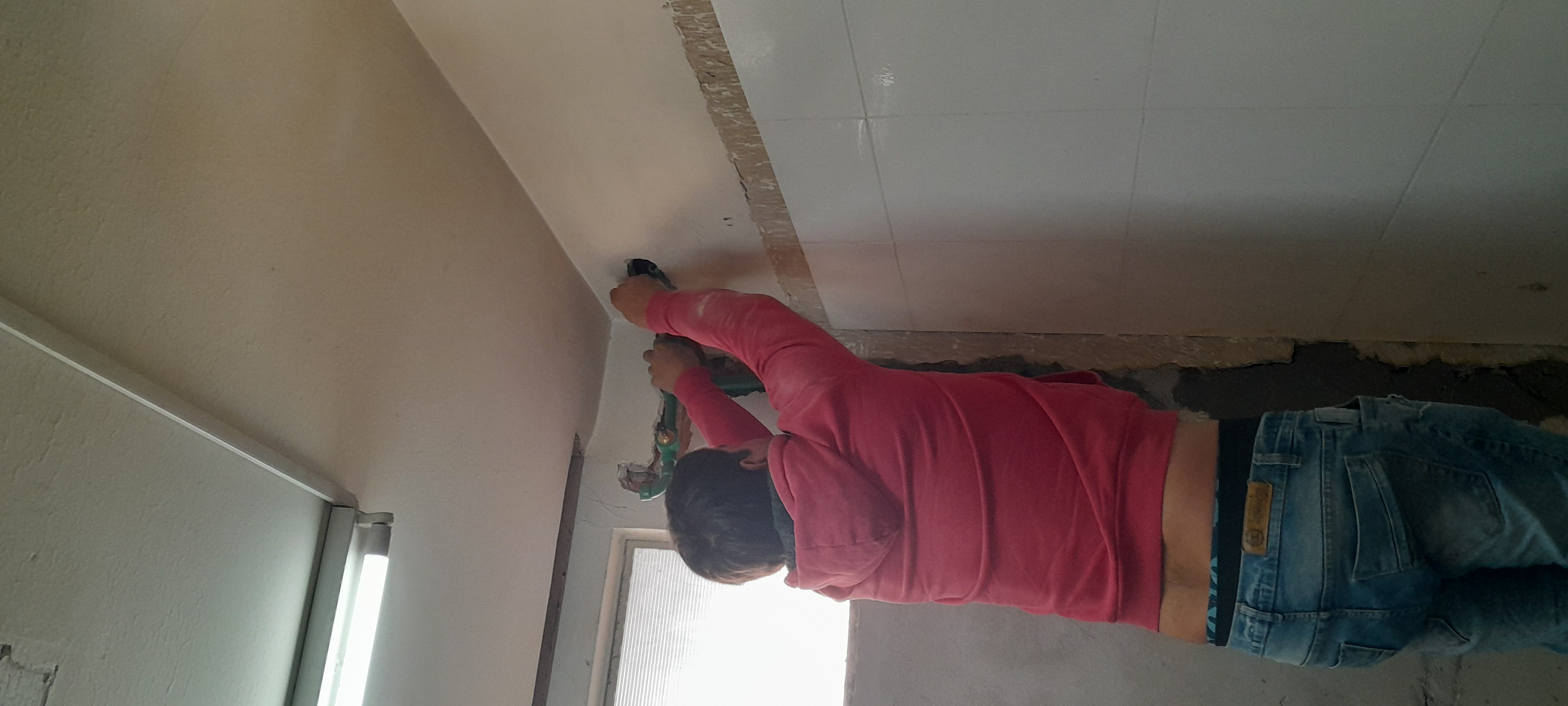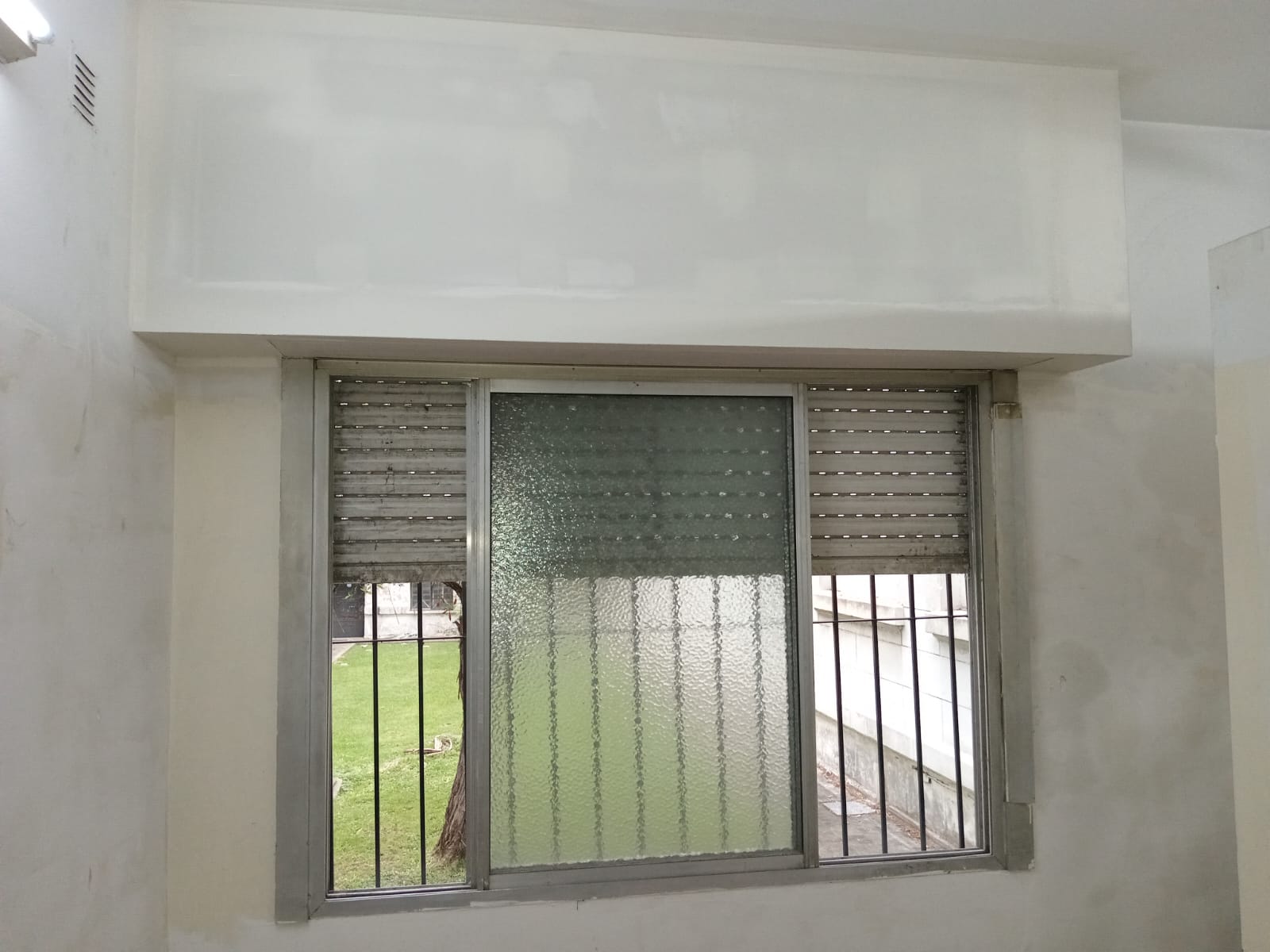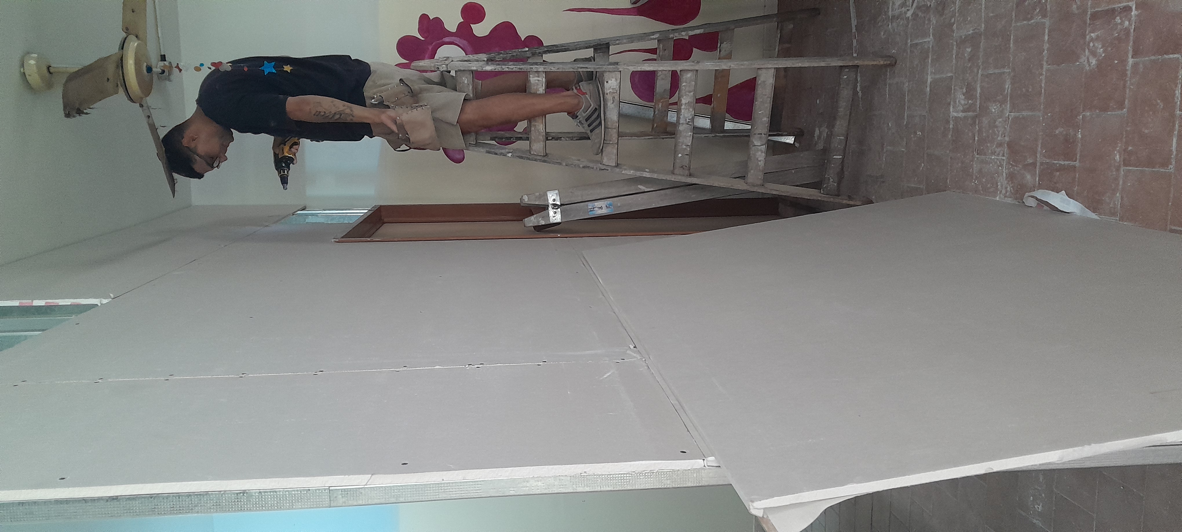 A partir de la ejecución a nuevo de los desagües cloacales del sanitario del piso superior suspendidos bajo losa, se hizo necesario realizar un cielorraso y el revestimiento de los muros exteriores deteriorados, ambos con placas de construcción en Seco. Por eso la Cooperadora nuevamente tercerizó las tareas con una Empresa dedicada a tal fin.