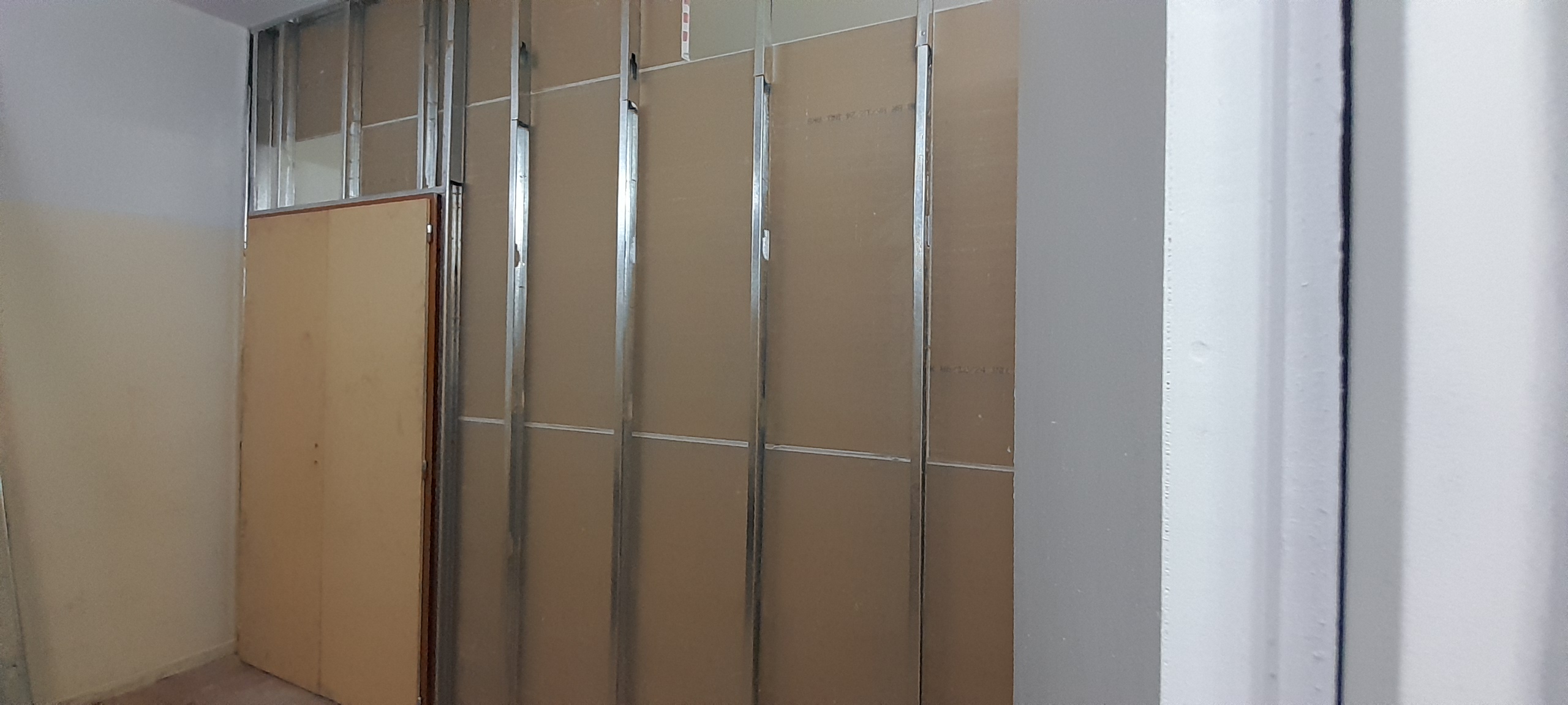 Optando por la propuesta más conveniente, se comenzó el 7 de Agosto con el desmonte de un paño de vidrio fijo, la realización de un tabique divisorio, a fin de independizar el ámbito del Conmutador y se colocó una nueva puerta de acceso.