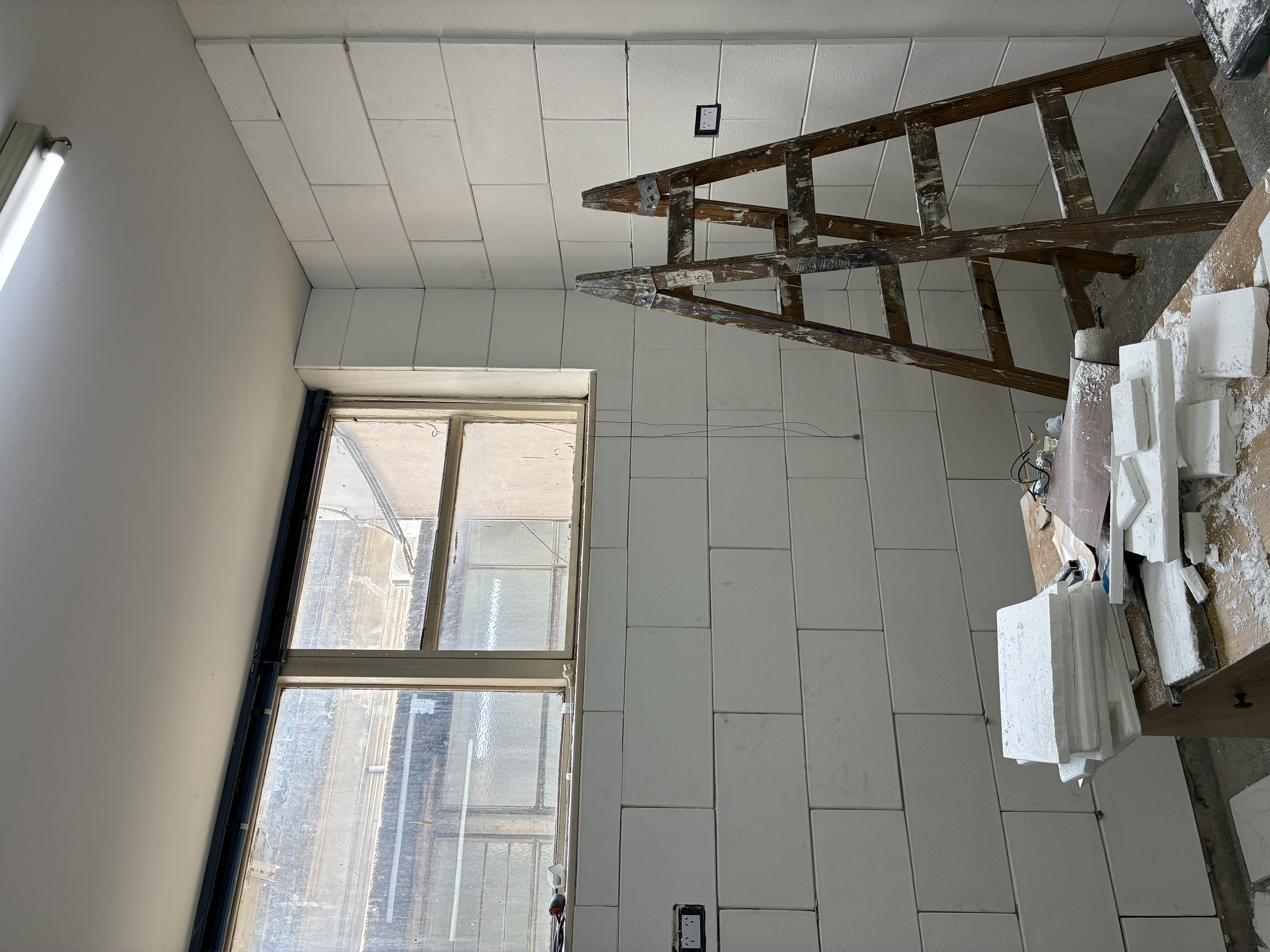 Ejecución cielorrasos, revestimiento de tabiques y Tareas de Pintura en Sanitario de Cirugía, en el 1°Piso Pabellón ArauzA partir de la ejecución a nuevo de los desagües cloacales del sanitario del piso superior suspendidos bajo losa, se hizo necesario realizar un cielorraso y el revestimiento de los muros exteriores deteriorados, ambos con placas de construcción en Seco. Por eso la Cooperadora nuevamente tercerizó las tareas con una Empresa dedicada a tal fin.