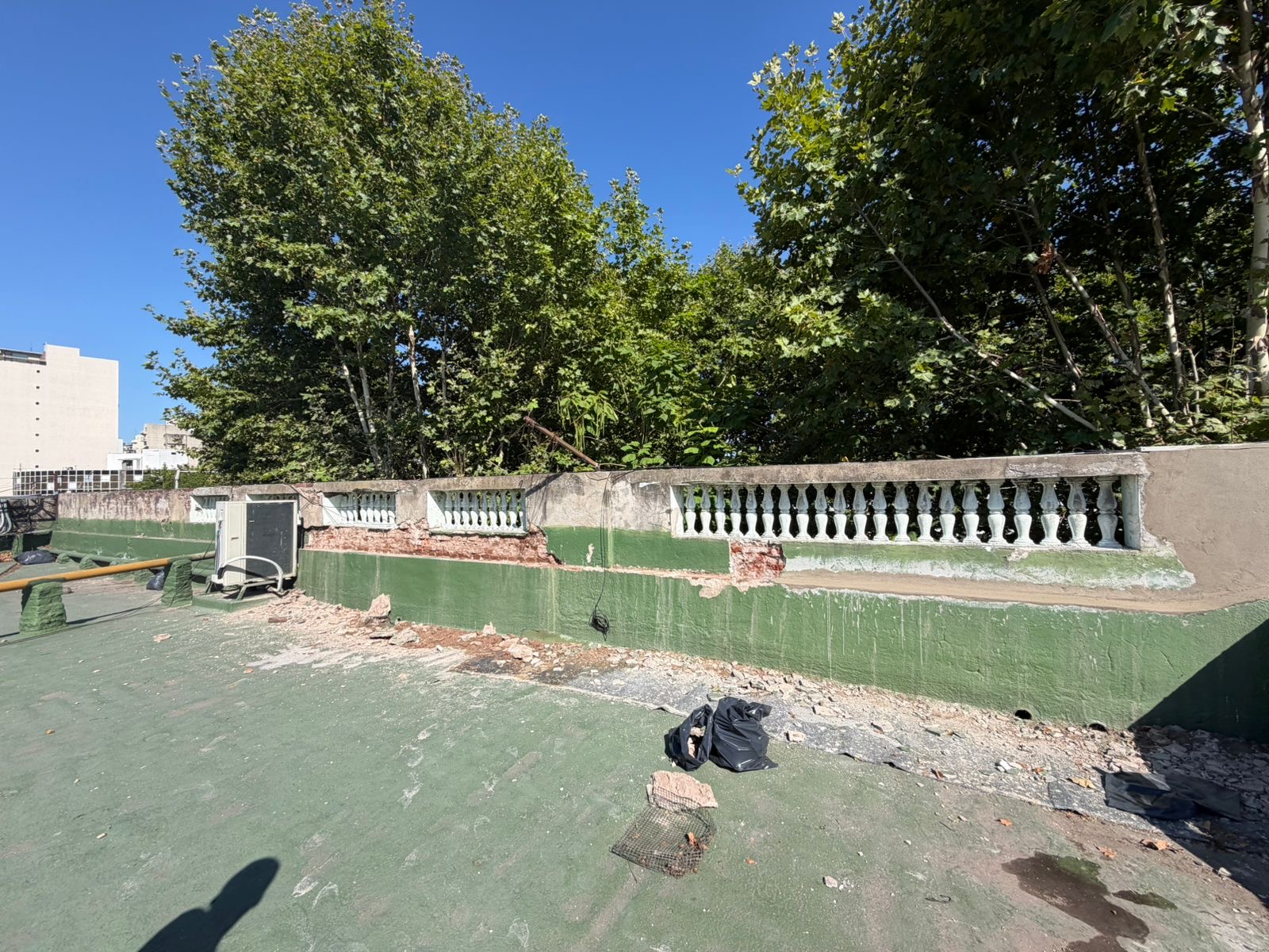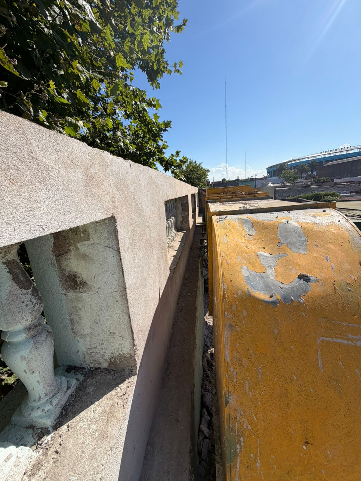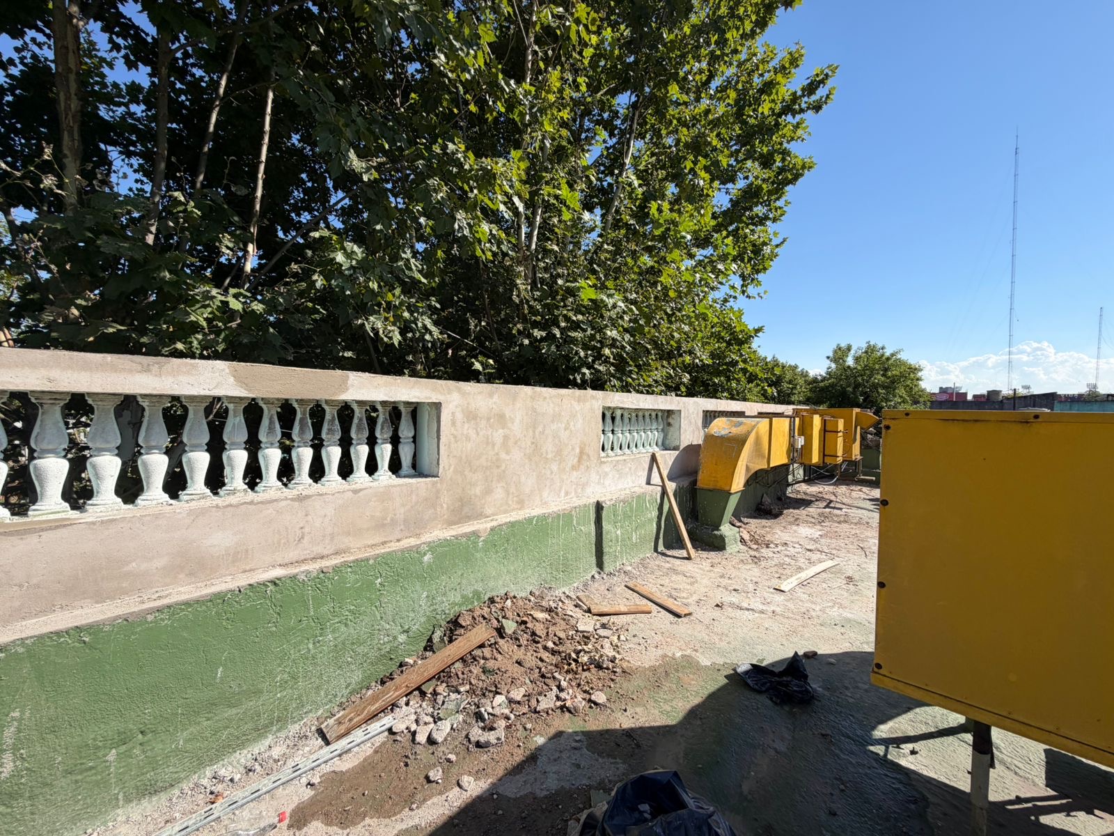 Realización de revoques en muro de carga Pabellón LaboratoriosDada la antigüedad del pabellón que contiene los laboratorios, en su fachada sobre la calle Italia, se producían desprendimientos de revoques del muro de carga, lo que ocasionó el ingreso de agua de lluvia hacia el interior. A fin de dar solución al problema, la Asociación Cooperadora tercerizo la ejecución de las tareas, las que comprendieron demolición hasta el ladrillo de revoques deteriorados o flojos, acarreo y retiro de escombros y ejecución de nuevos revoques con agregado de hidrófugo. Una vez finalizadas las tareas se procedió a aplicar dos manos de acrílico a fin de reforzar la impermeabilización, con el mismo método que se aplica a las cubiertas, para de esta forma evitar nuevas filtraciones y a la vez proteger el equipamiento del Laboratorio Central.